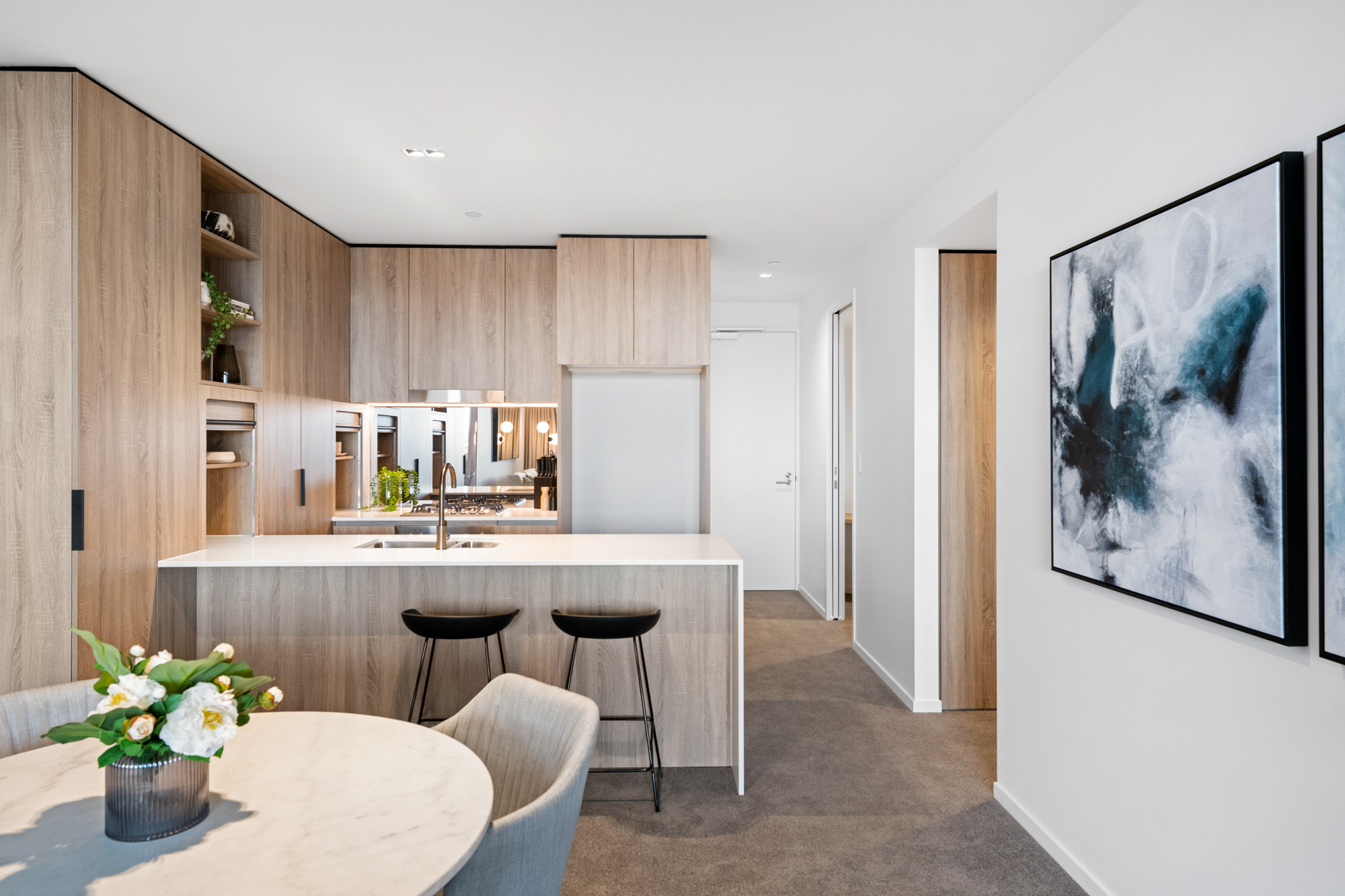 Benefiting from a sprawling open aspect with city glimpses, apartment 906 is fit for a family, featuring two master suites, a very generously sized multi-purpose room, and a well-appointed study room with custom joinery.