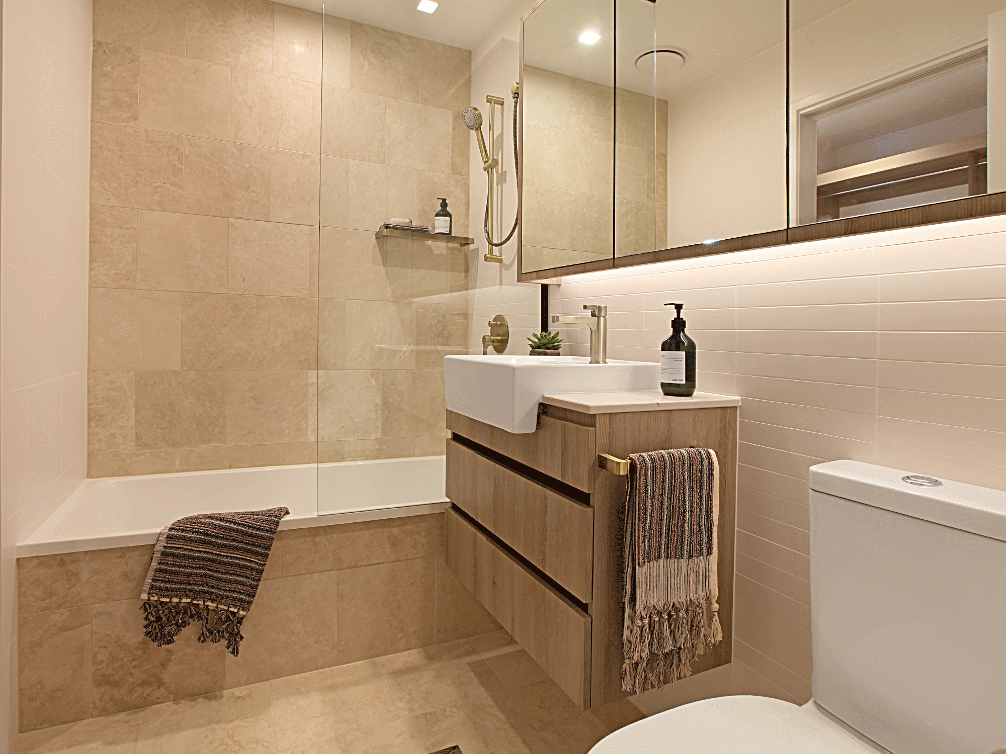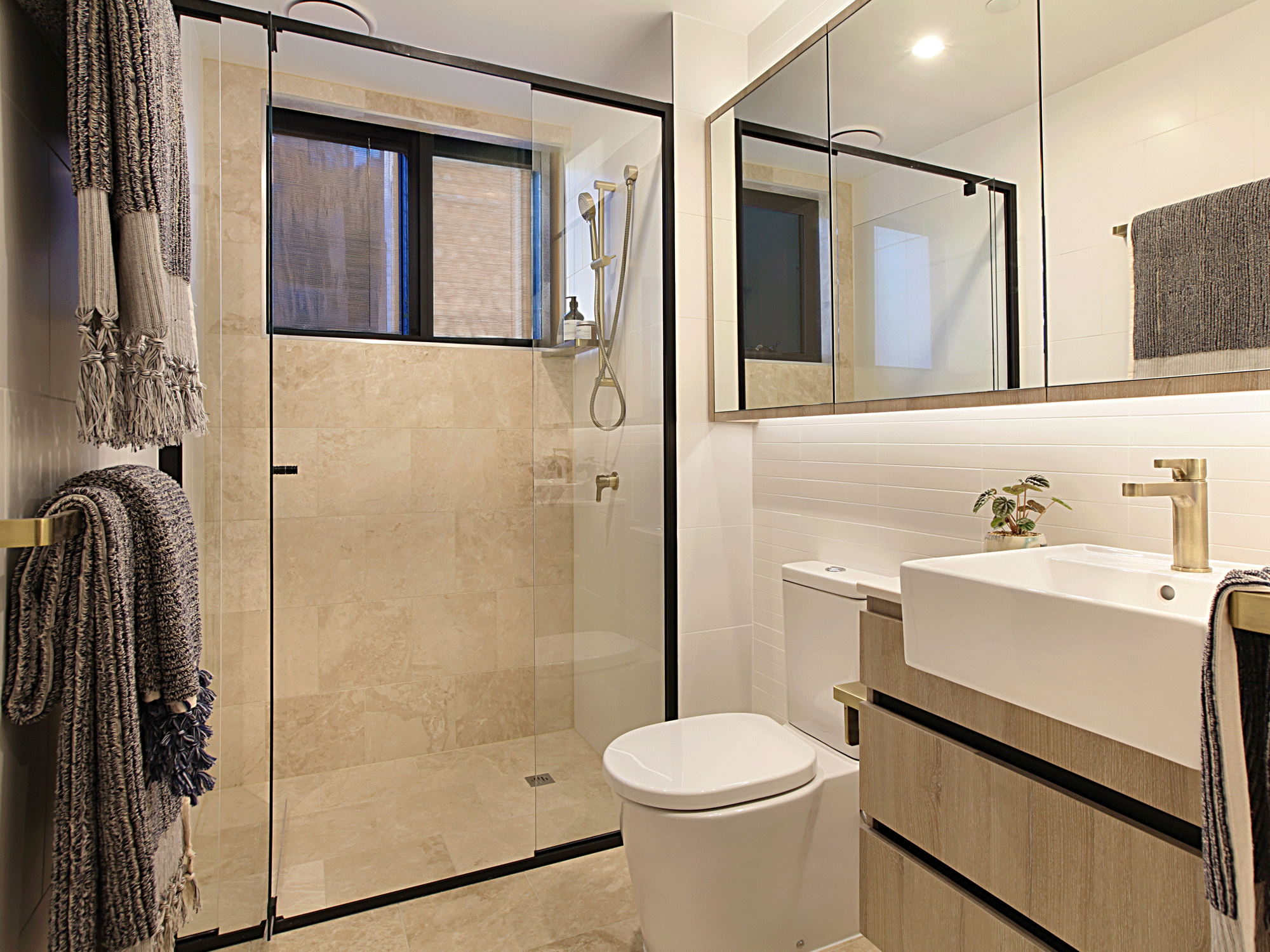 Two sophisticated and well-sized master retreats are acoustically treated with premium block out curtains, and over 25m of double hanging his & hers wardrobe space. The ensuites to both bedrooms offer ample eye-level and under-bench storage and premium fixtures. Plus, the master ensuite enjoys natural light and ventilation via a well-positioned high-window.