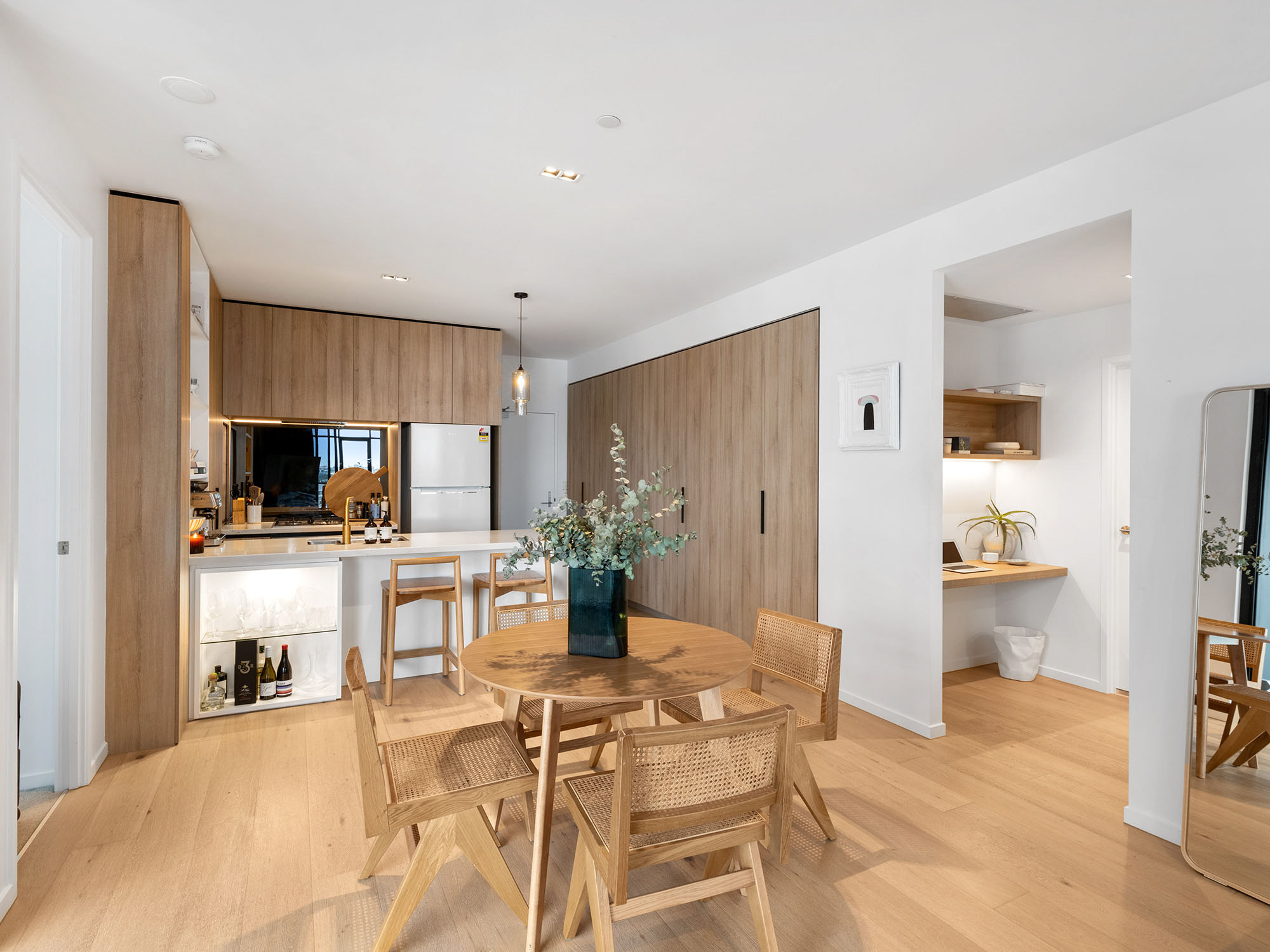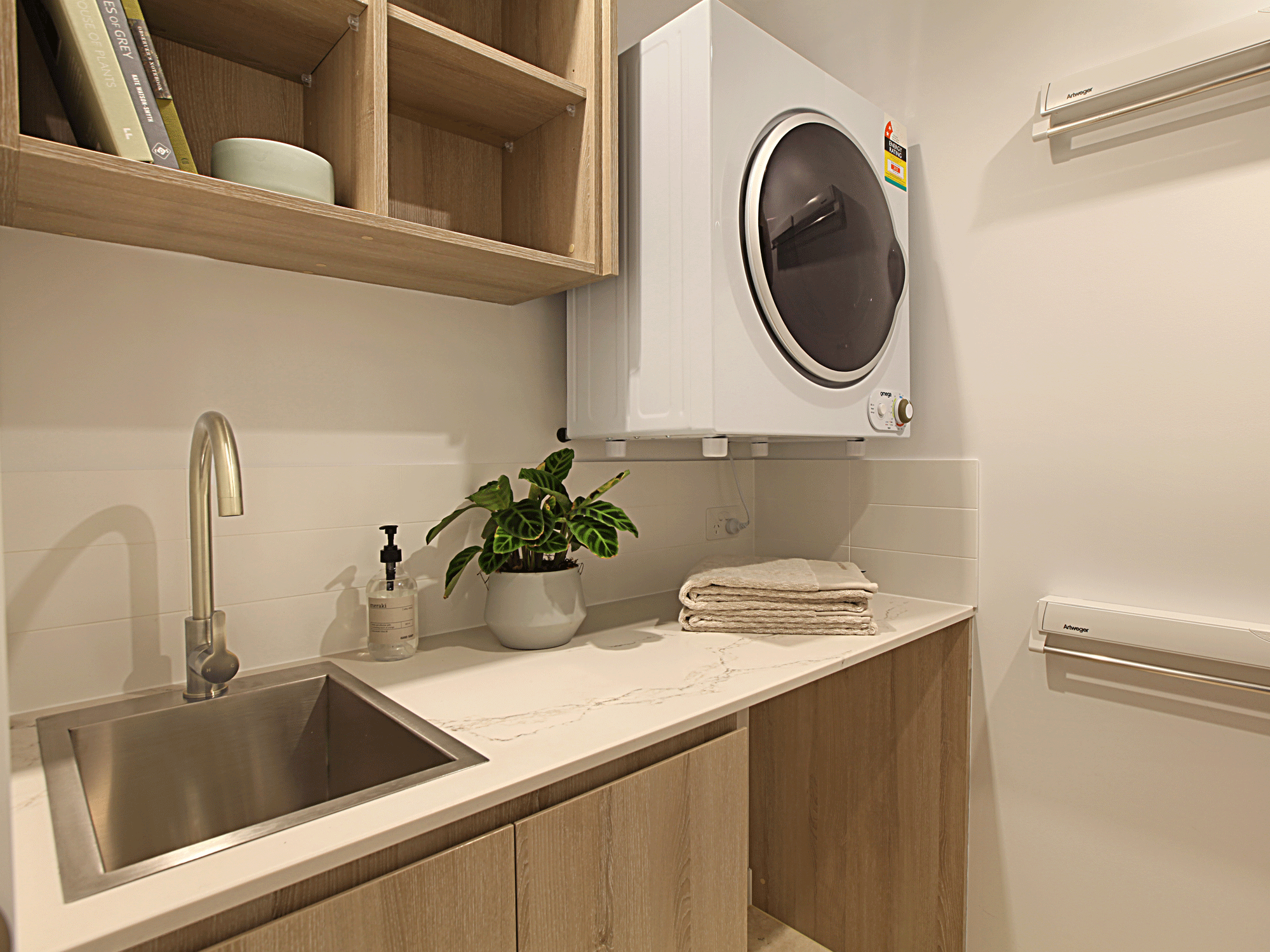Cleverly integrated joinery is found throughout, including expansive linen and broom cupboards to effortlessly accommodate your daily essentials. The walk-in laundry is equally well-appointed, featuring custom floor-to-ceiling joinery and built-in drying racks for ultimate functionality.
