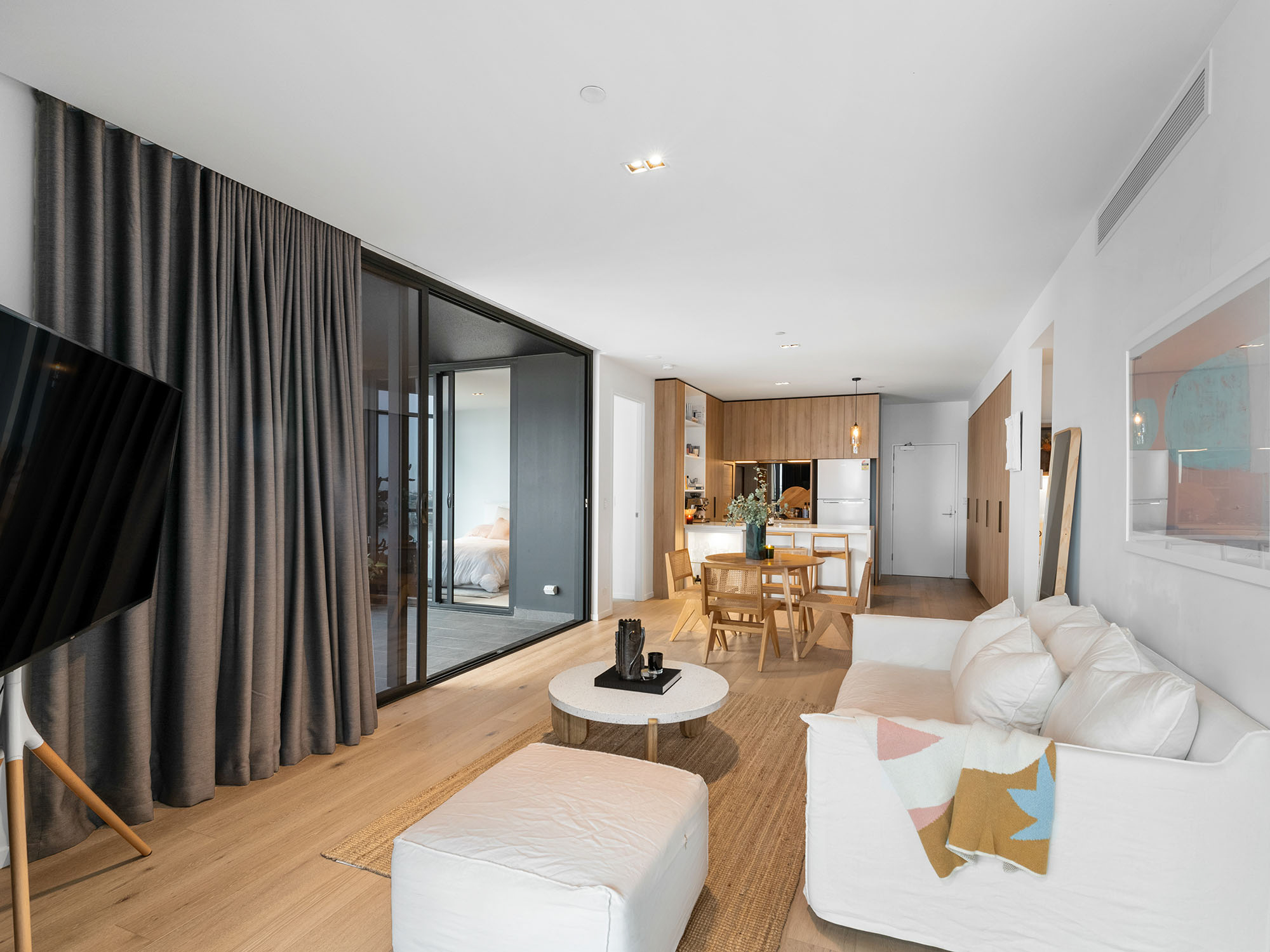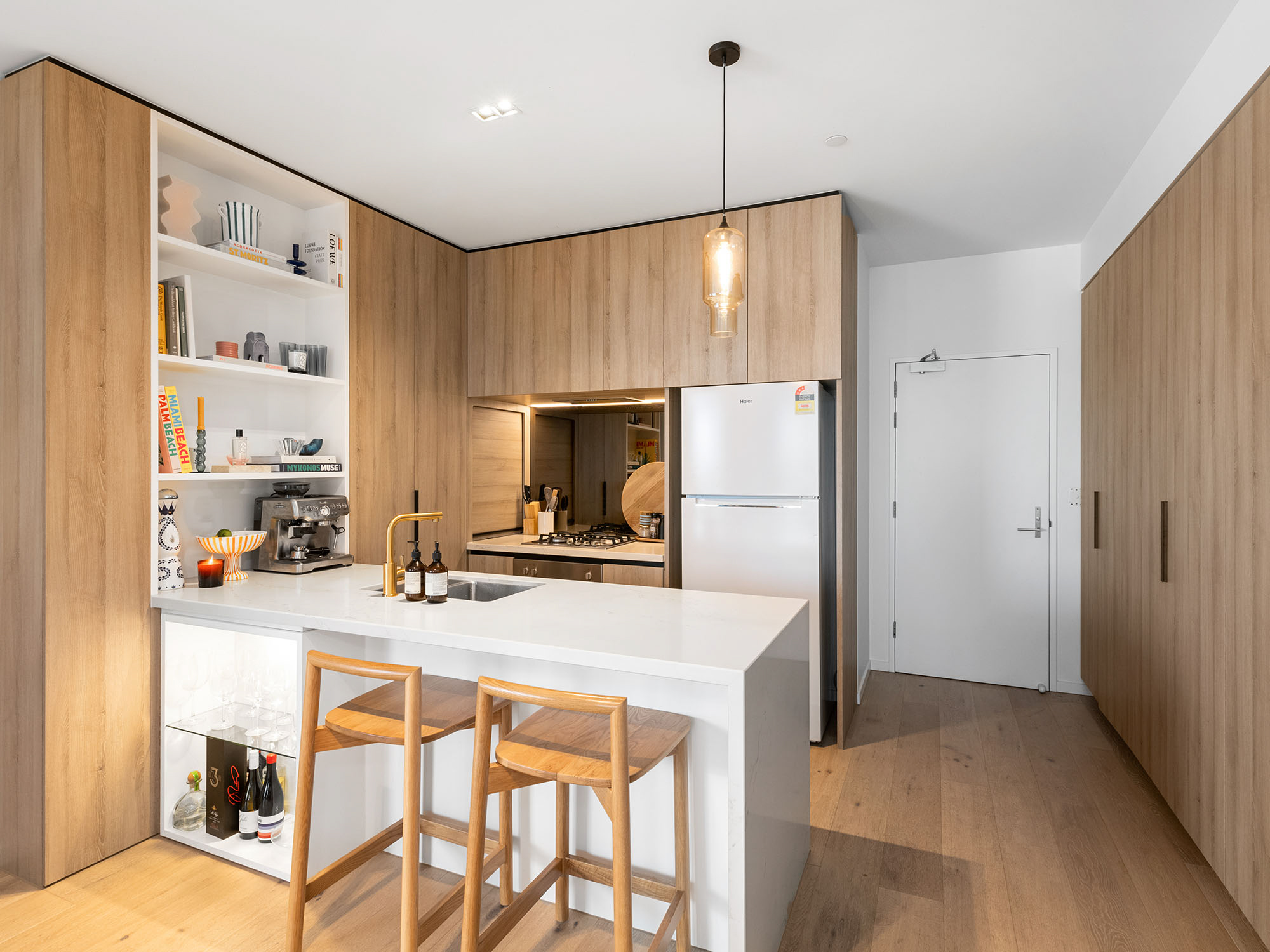 The kitchen is the heart of the home, centered around a striking monolithic marble waterfall bench that flows seamlessly into the expansive open-plan living area, connecting effortlessly with the outdoors. It is enhanced by generous full-height storage, both within and adjacent to the kitchen, perfect for your essential household items or as an extension of your culinary space.