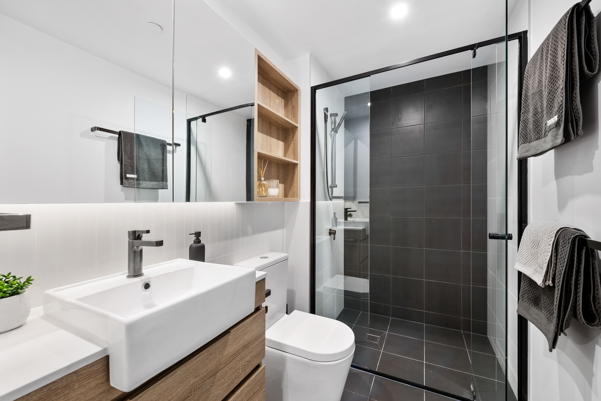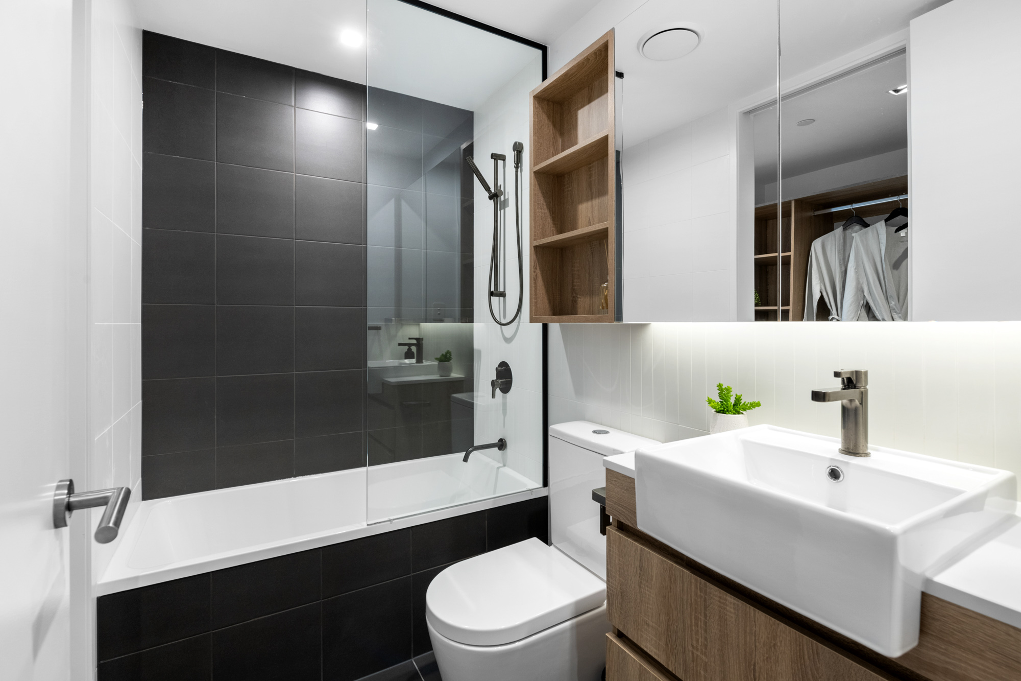 7. Ensuite with mirrored vanity cabinet, semi recessed basins, shower and bath