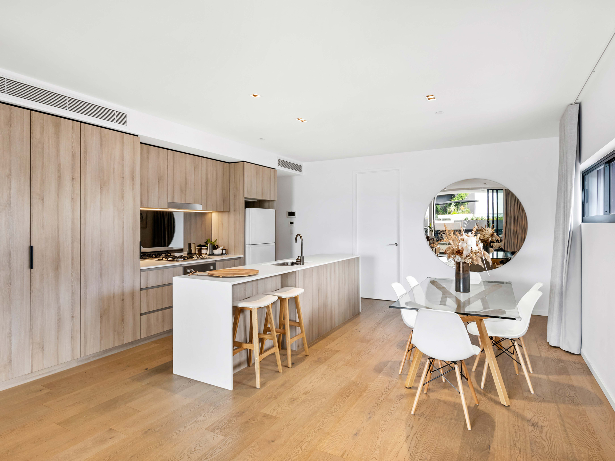 The striking curved cantilever balconies create tranquil outdoor spaces to enjoy both river breezes and sunset views. The abundant joinery including generous linen and broom cupboards maximises storage and caters for essential home items as well as a separate laundry.