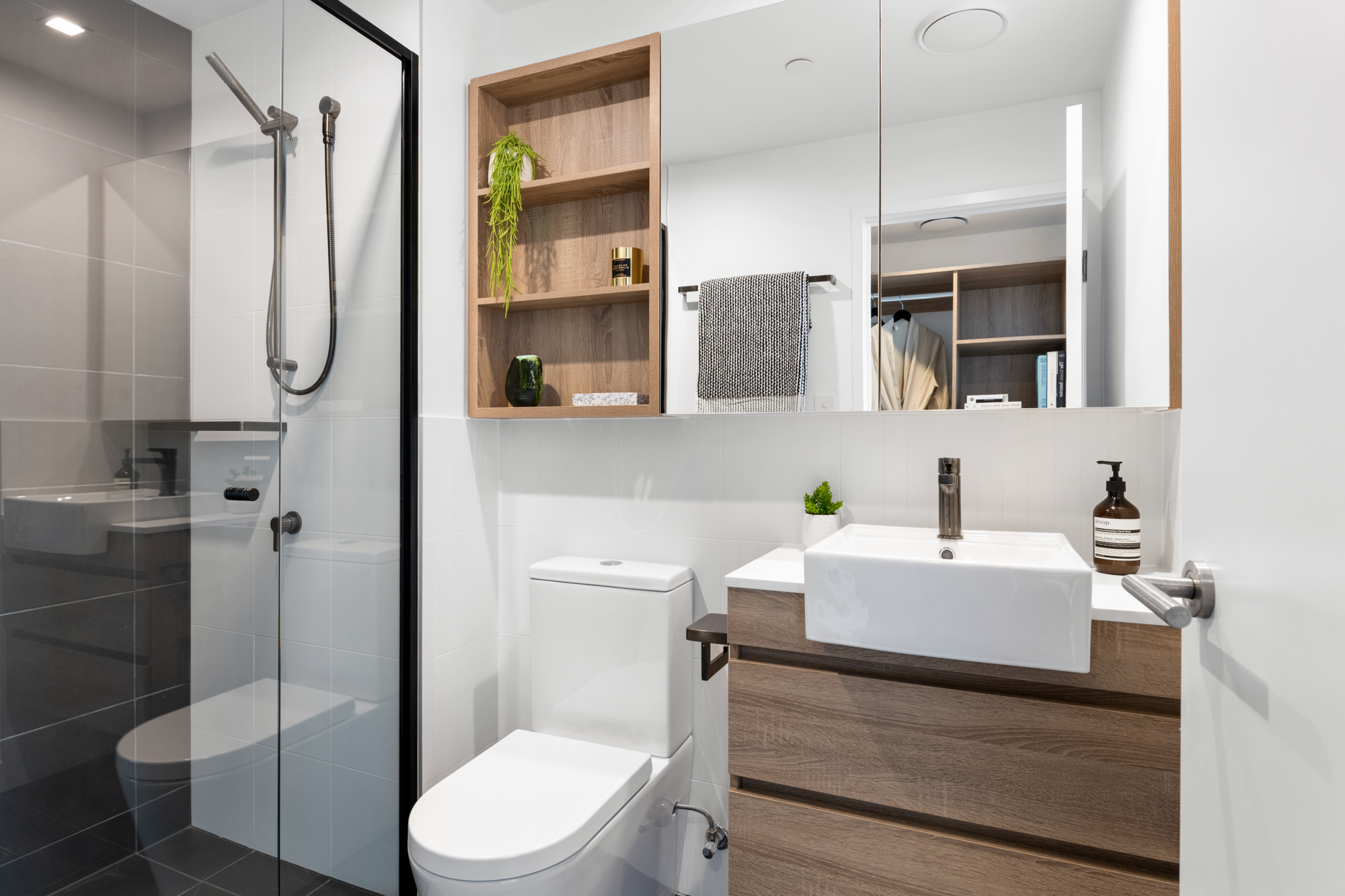 – Ensuites with mirrored vanity cabinet, semi-recessed basins, shower and bath