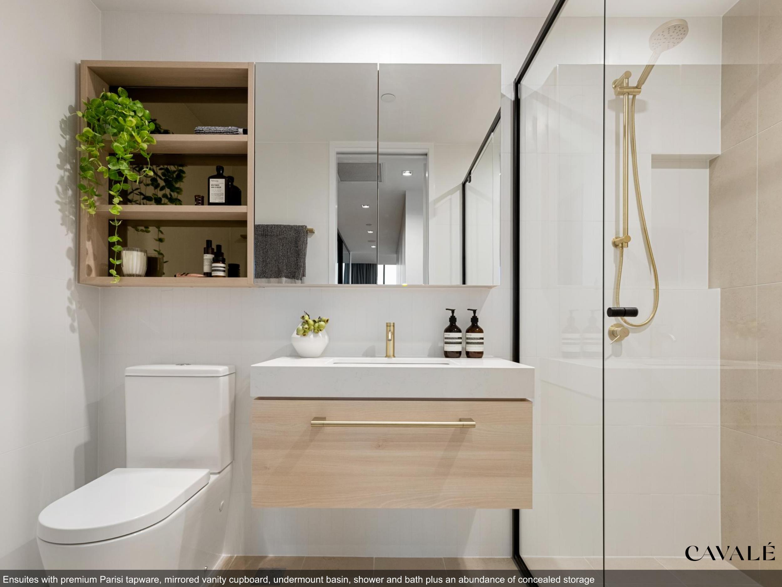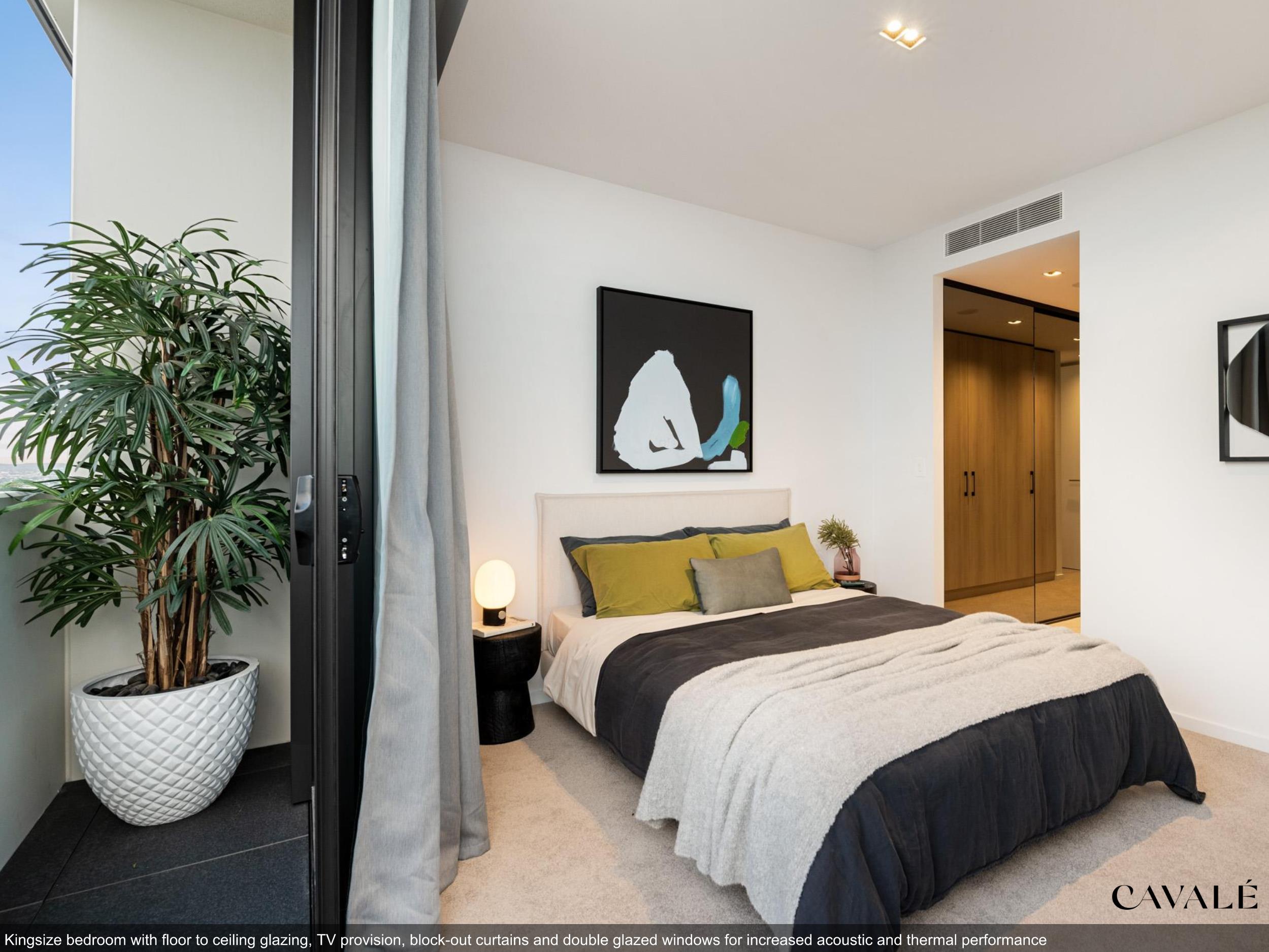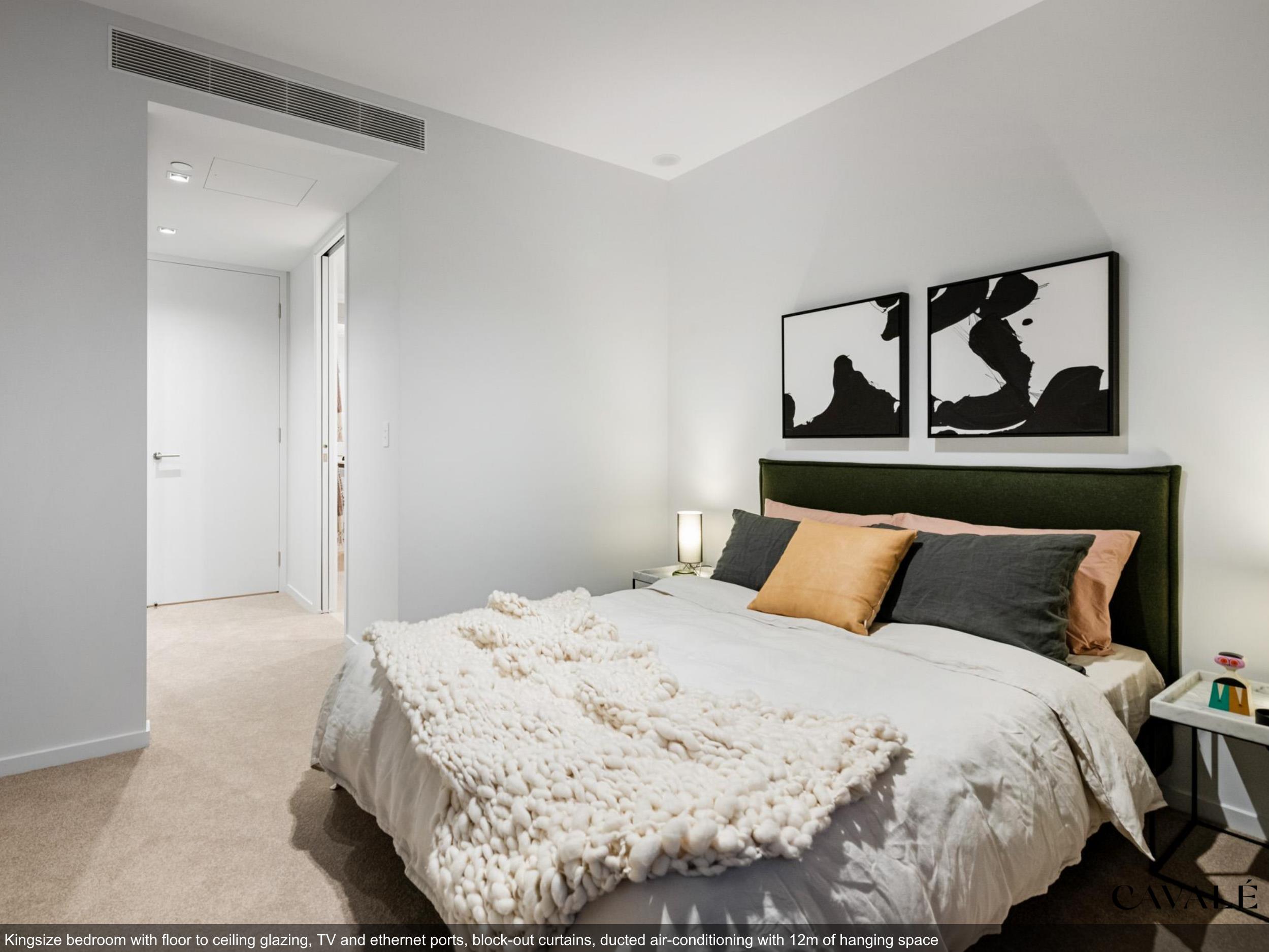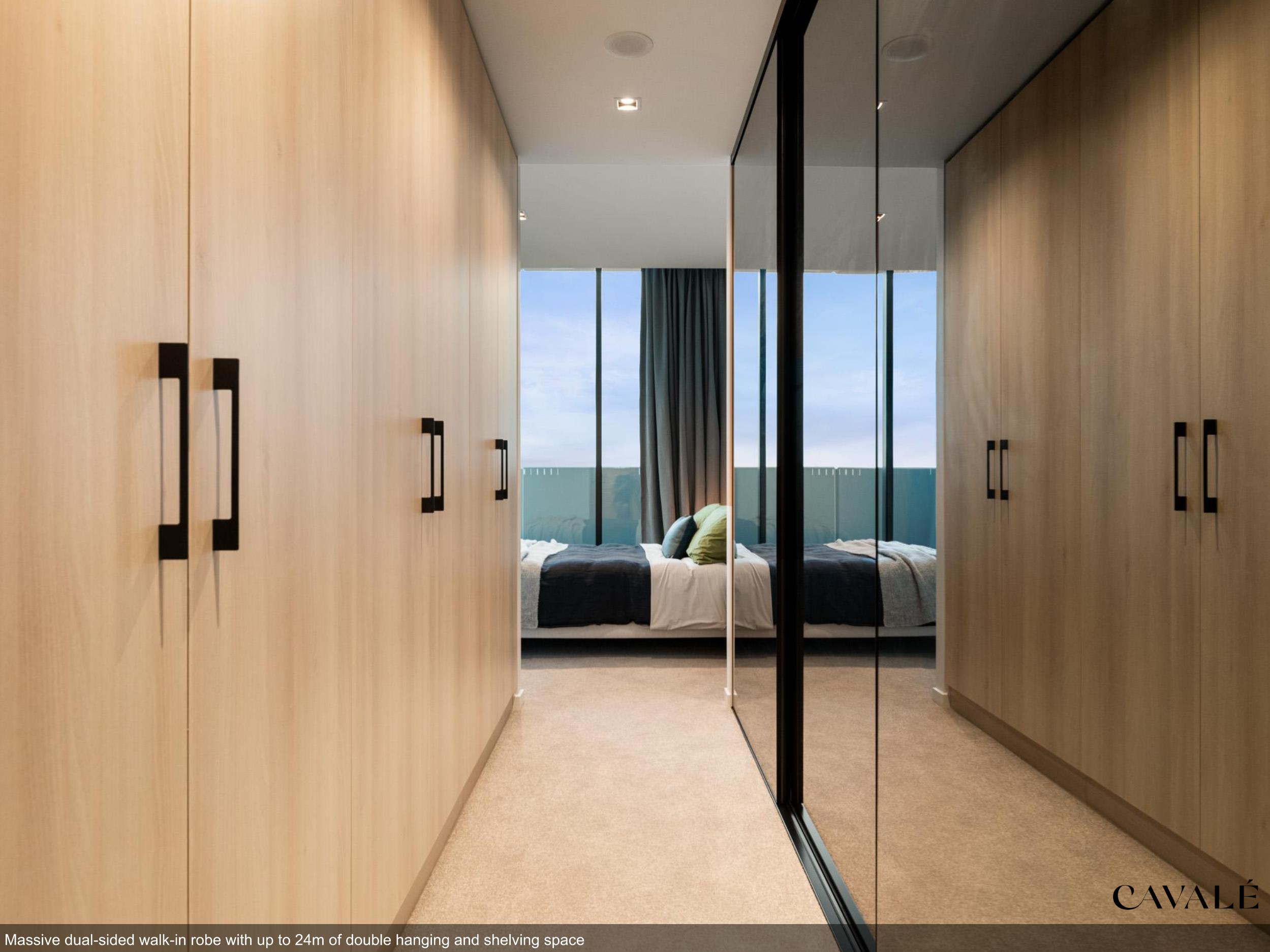 Luminare is Cavcorp’s latest architectural landmark with exceptionally large internal layouts, soaring 2.7m ceilings and full-height stackable double glazed sliding doors that bring the outside in. The gourmet kitchen with stone breakfast bar and full height joinery flows gracefully into a spacious dining and lounge / home cinema space. The two master bedrooms feature up to 12m of double hanging walk-in-robe space, ensuites with mirrored vanity cabinets, abundant towel and shelving space, TV provision, block out curtains and double glazed acoustic windows.