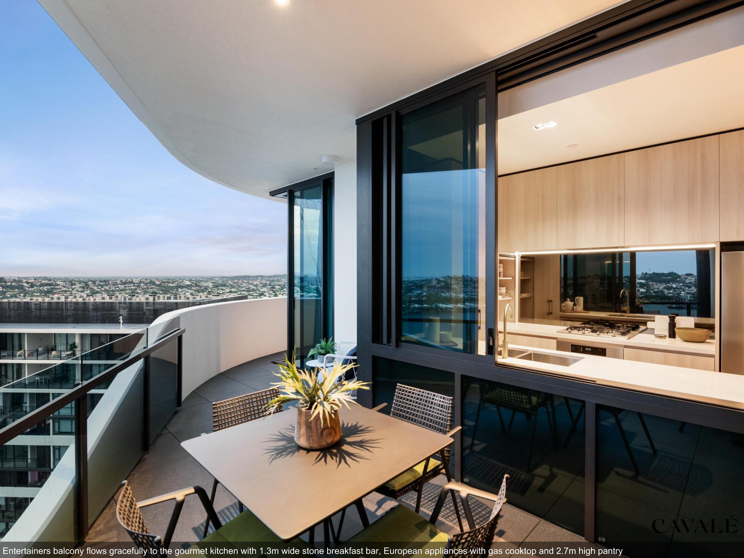 The striking bronze glazing and curved balconies create tranquil outdoor spaces to enjoy both river breezes and sunset views. The abundant joinery including generous linen and broom cupboards maximises storage and caters for essential home items as well as a separate laundry.