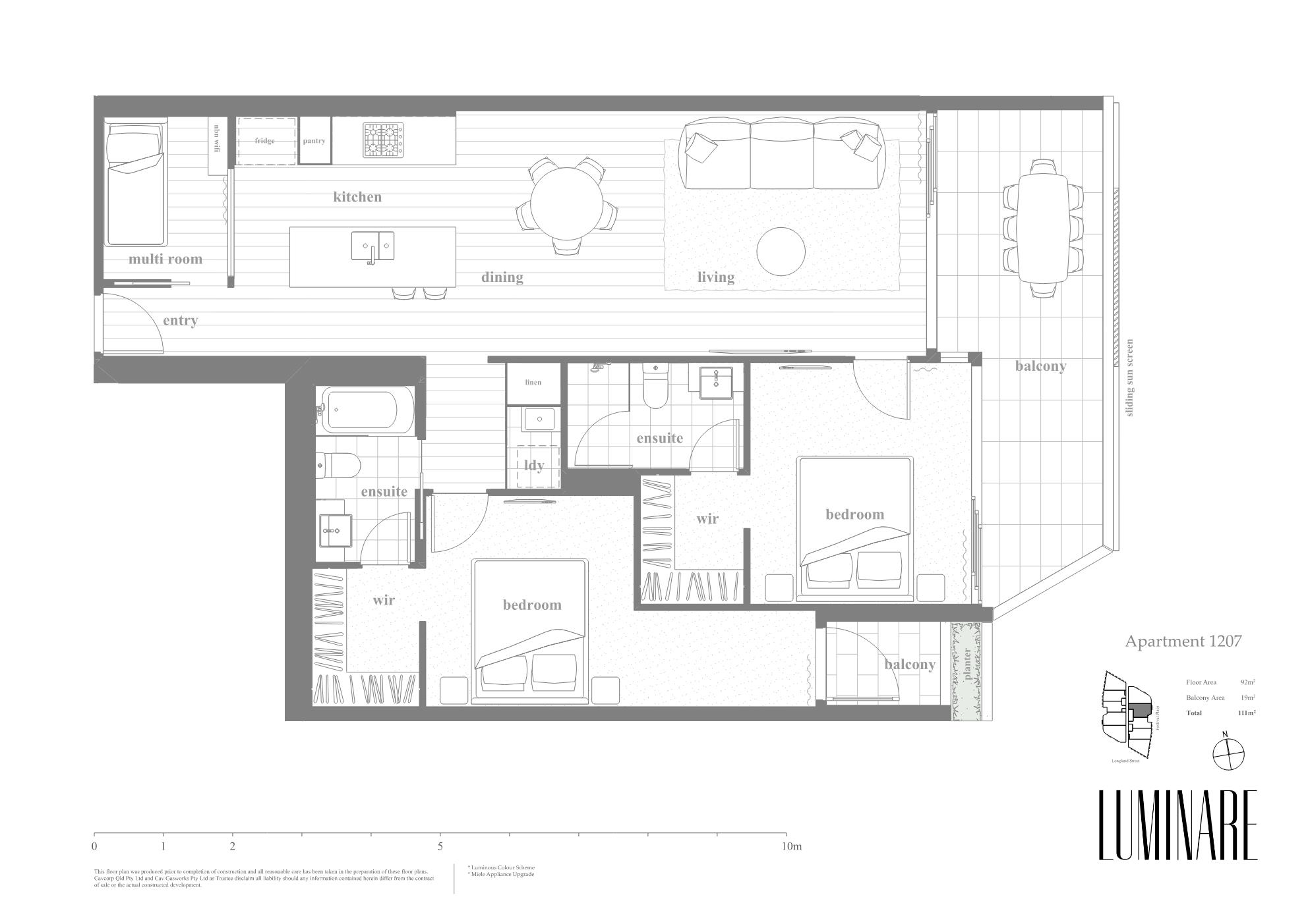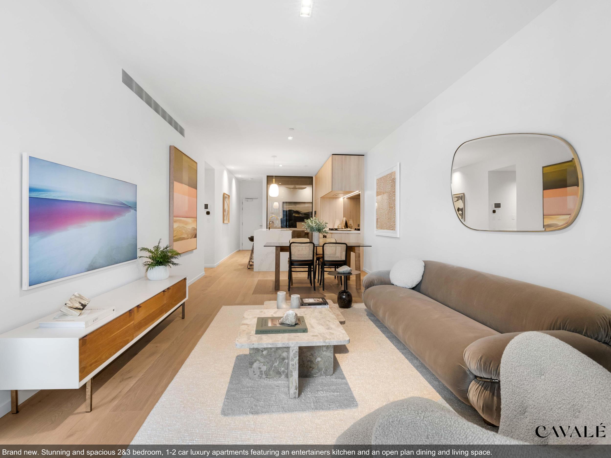 Luminare is Cavcorp’s latest architectural landmark with this corner apartment having an exceptionally large layout of 111m², soaring 2.7m ceilings and full-height stackable double glazed sliding doors that bring the outside in. The gourmet kitchen with stone breakfast bar and full height joinery flows gracefully into a spacious dining and lounge / home cinema space and separate laundry. The two master bedrooms feature up to 12m of double hanging robe spaces, ensuites with mirrored vanity cabinets, abundant storage and shelving space, high speed Wi-Fi & TV provision, block out / sheer curtains and double glazed acoustic windows.