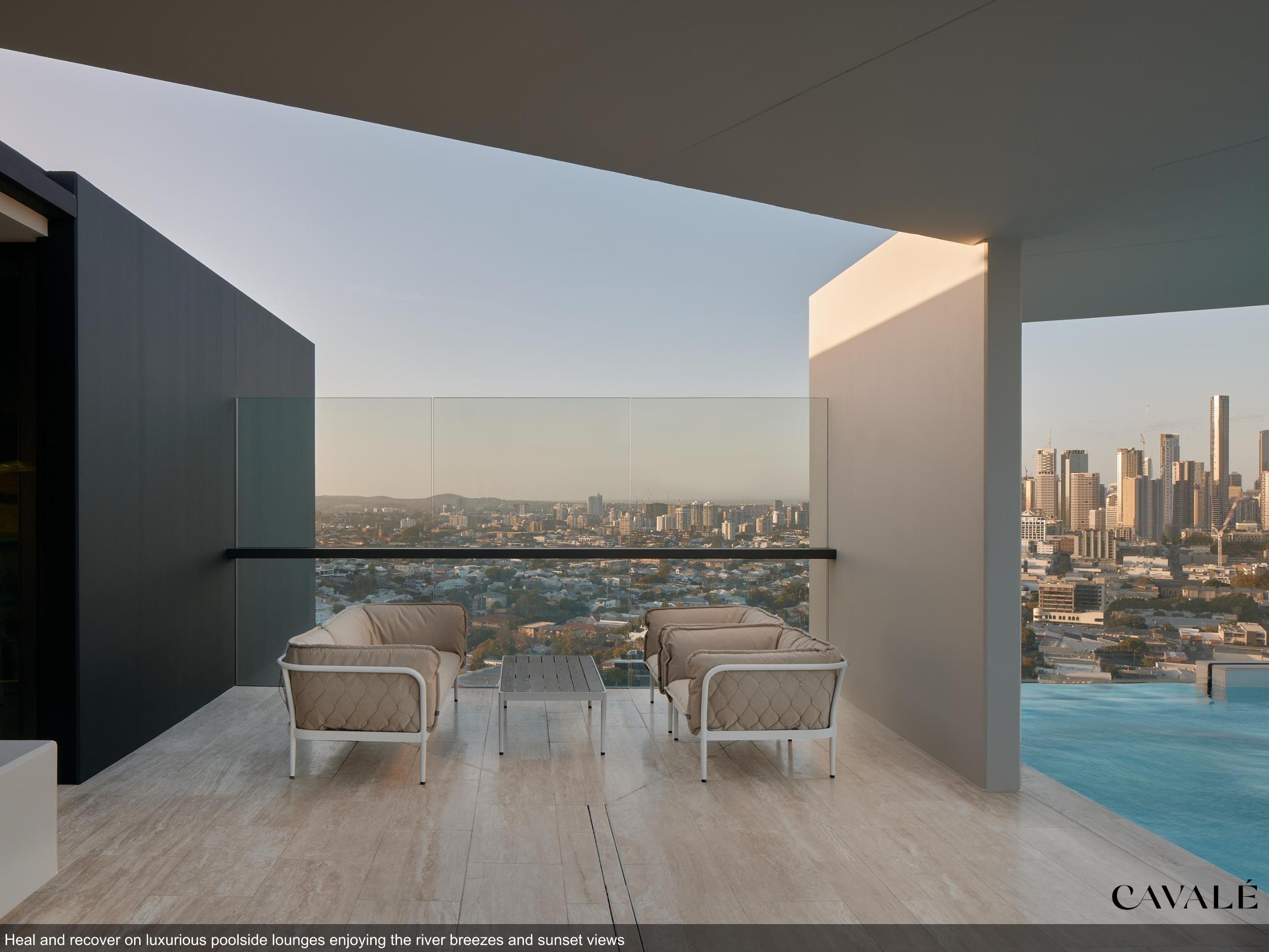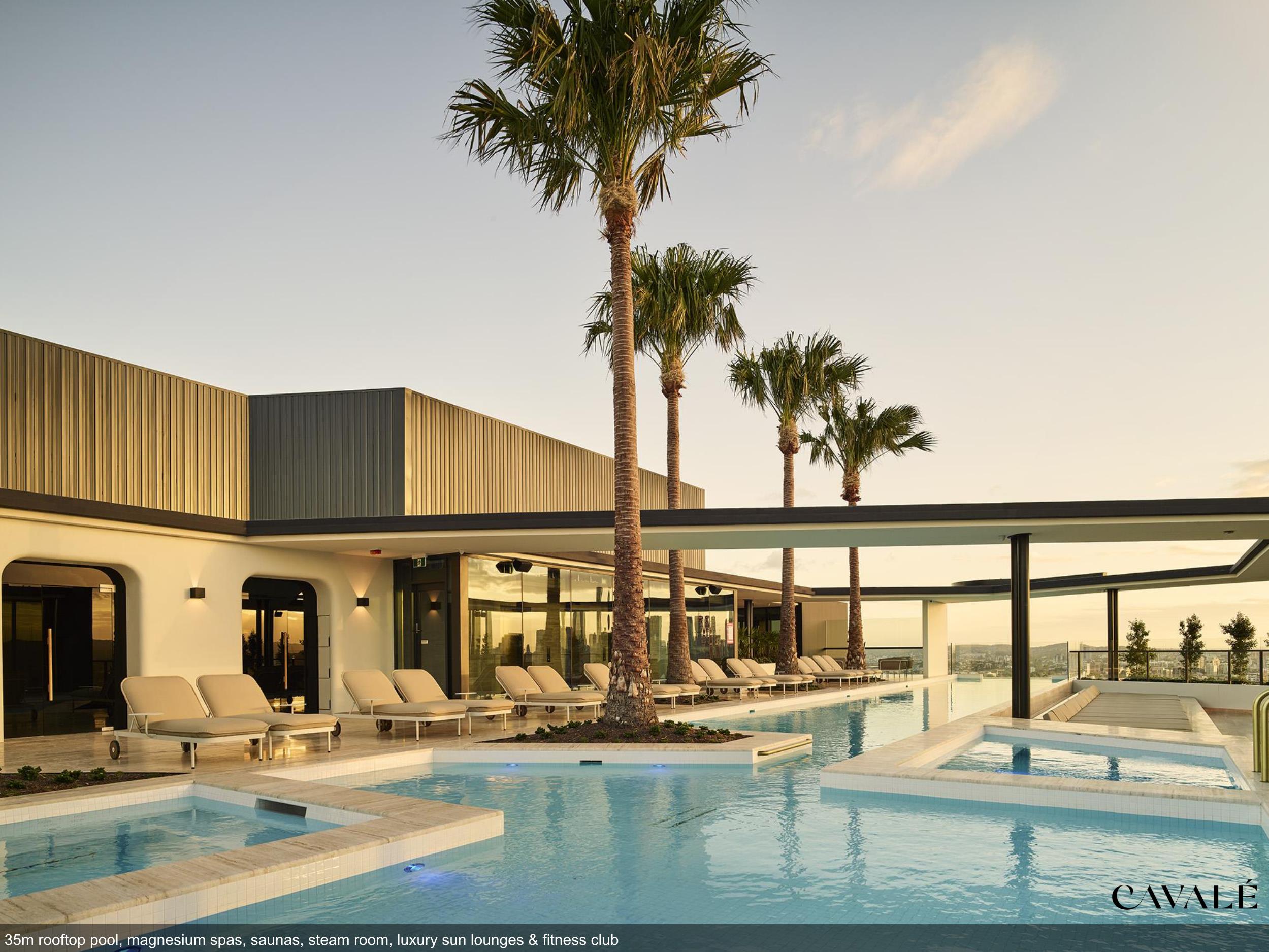 • Glass bottom, cantilevered 35 metre long rooftop heated pool with underwater speakers and immersed in ALL-DAY SUN surrounded by luxury sunlounges!