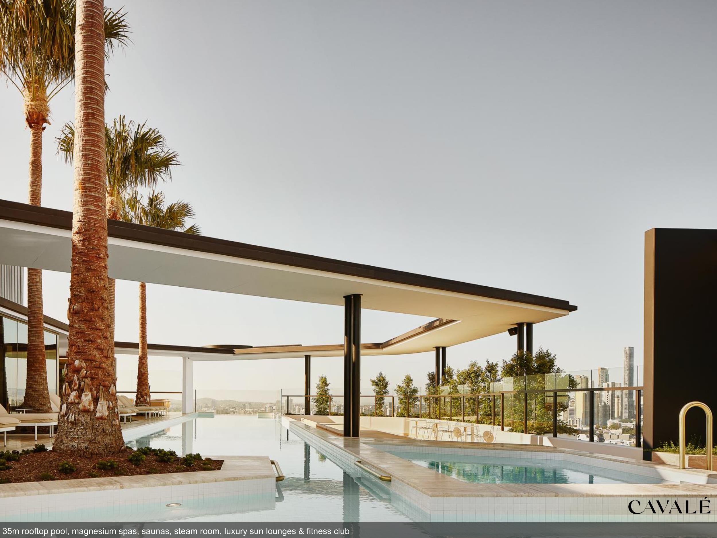 • Glass bottom, cantilevered 35 metre long rooftop heated pool with underwater speakers and immersed in ALL-DAY SUN surrounded by luxury sunlounges!