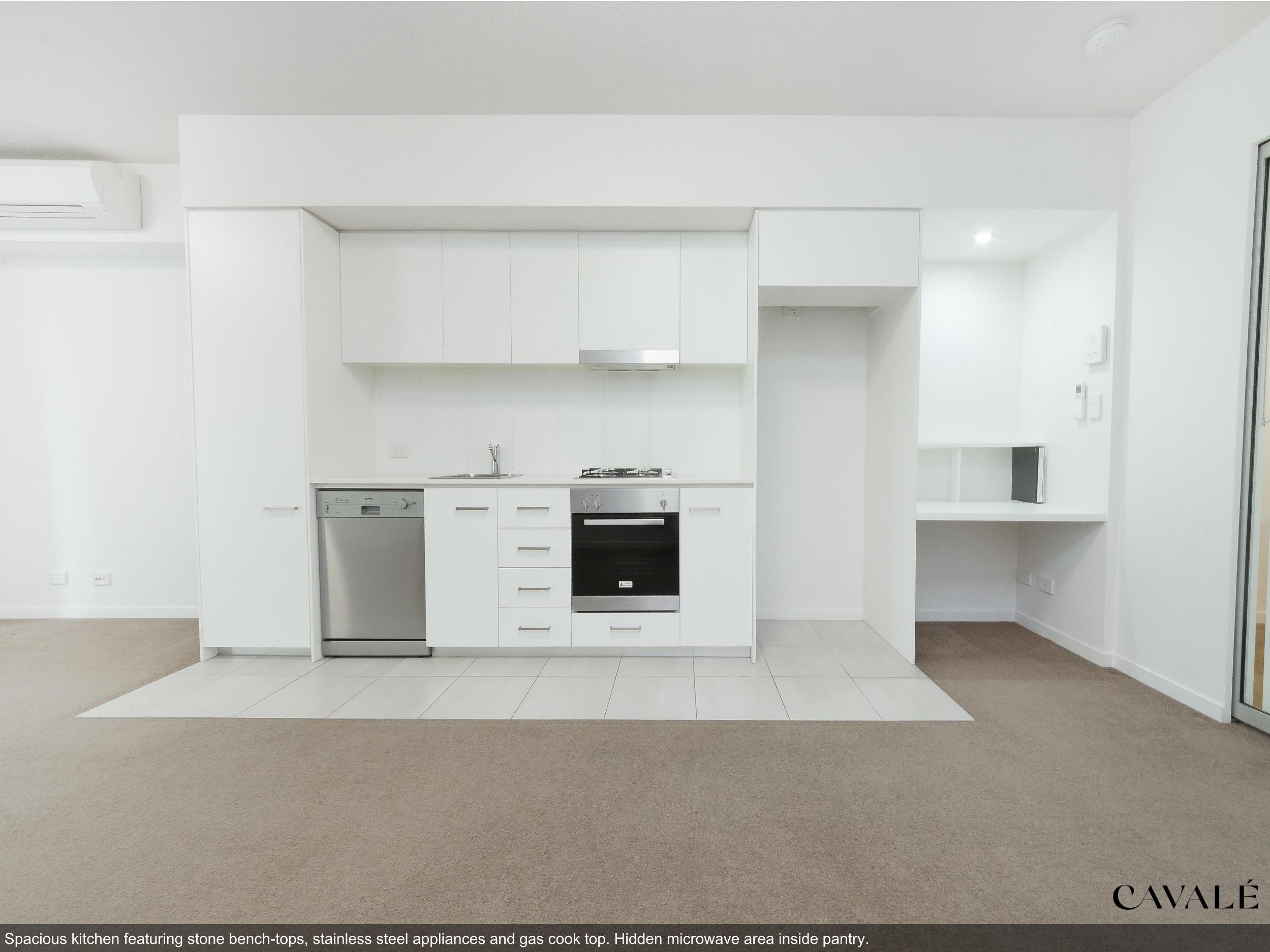 • Full height pantry, appliance cupboards, stone bench tops, stainless steel European appliances with gas cooktop
