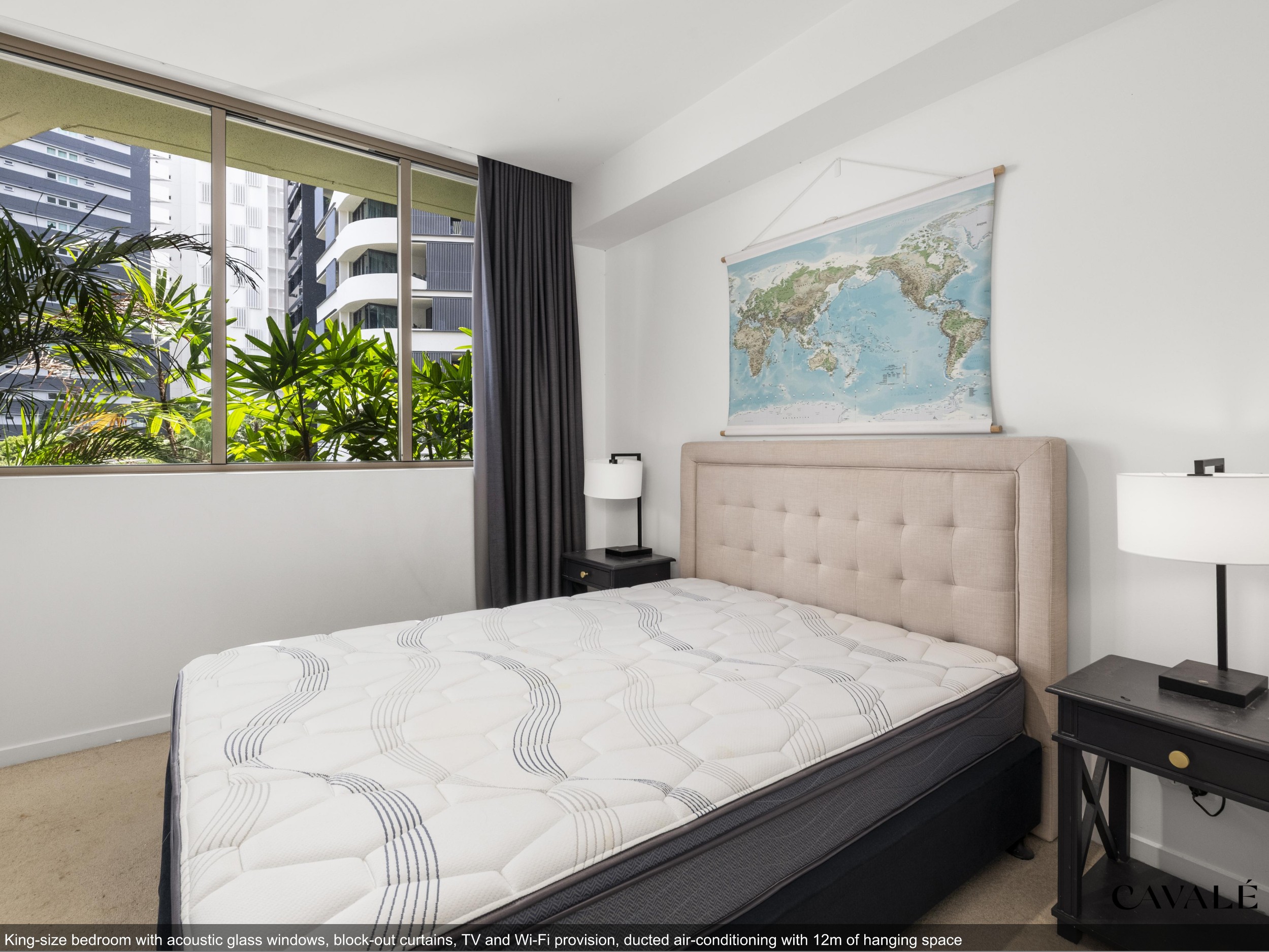 • Master bedroom king size includes acoustic and tinted glazing, block out + sheer curtains & TV provision