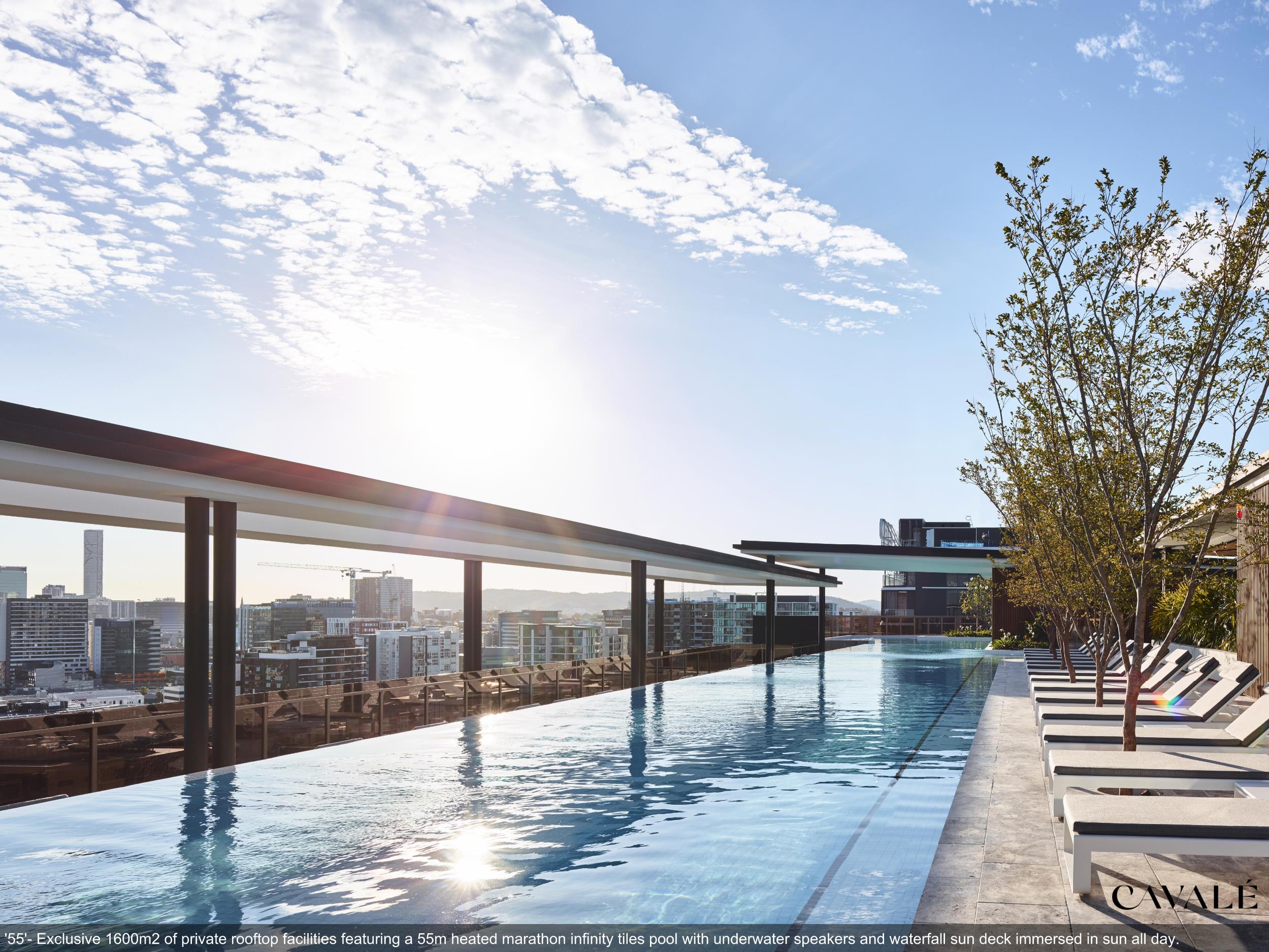 • 55m infinity pool with underwater speakers, heated sunset spa and waterfall deck