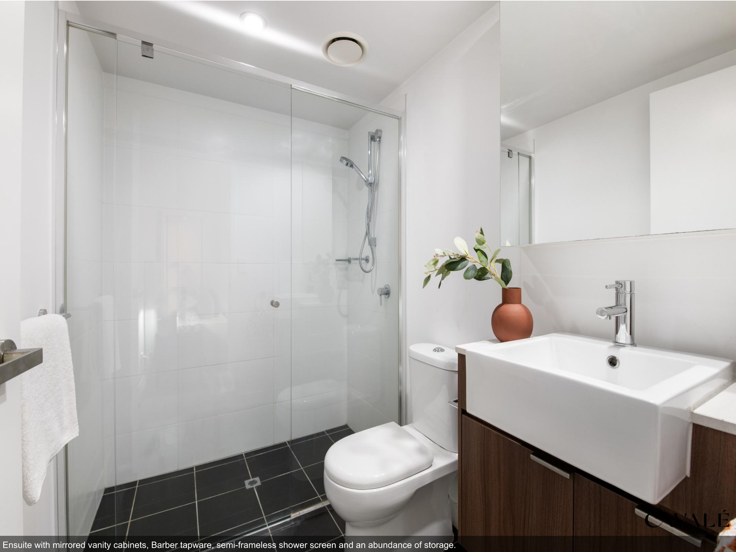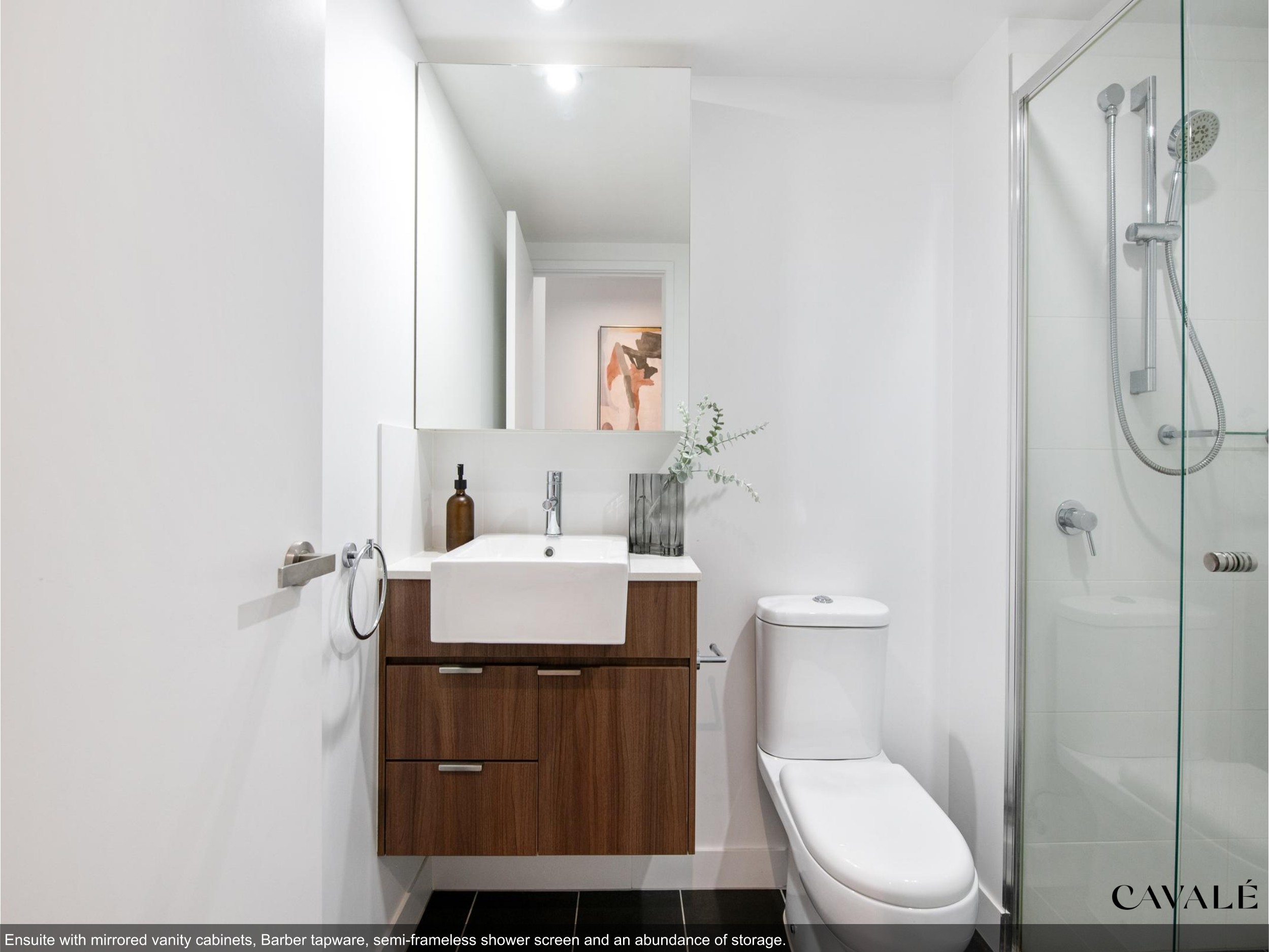 • Ensuite with mirrored vanity cabinets and shower